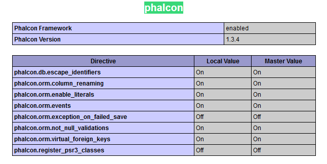To validate whether Phalcon is up and installed successfully, again execute the phpinfo.php file in your browser and search for Phalcon. You may see the following screenshots.