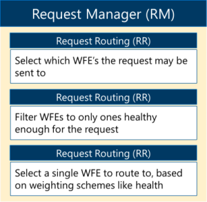 SharePoint 2013 uses the routing and pools to manage the request. Routing rules route requests and are associated with MachinePools. MachinePools mainly contain servers. Servers use weights for routing – static weights and health weights. Static weights are constant for WFEs; health weights change dynamically based on health scores.