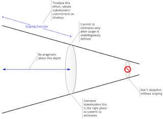 So what is the right time to commit to an estimate? The cone of uncertainty provides the answer, and I particularly like Construx's interpretation of the cone of uncertainty. As its cone of uncertainty poster says, the right time to commit to an estimate is when detailed technical requirements are complete, and possibility of estimate variation is within 20-25%. I call it a Scoping Exercise - a scope that is unambiguous and close ended (it is explicitly agreed what is not included in scope). Opinions may vary about what is unambiguous and within 20-25% of estimate variation range, I will share mine in a separate post!