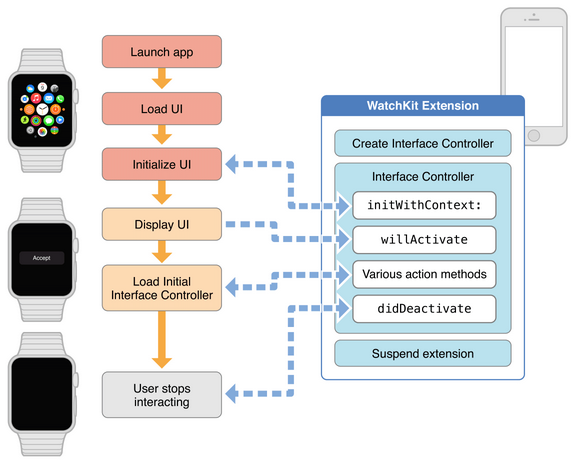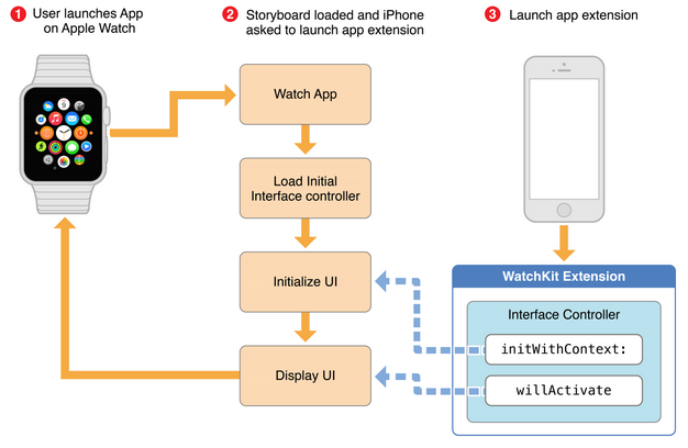 When a user launches the watch app, the iPhone launches the WatchKit extension automatically. Through a series of transparent handshakes, the Watch app and WatchKit extension are connected to each other enabling messages to flow between them. Messages keep flowing between the iPhone and Apple Watch till the user interacts with app.