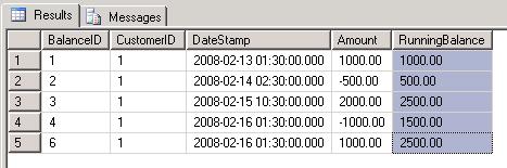 The result is achieved by a self join of the Balances table. The first table b1 returns the complete table output, inner join has two conditions. The first condition 'b1.DateStamp >= b2.DateStamp' is the most important which gives the result for SUM(b2.Amount). The last two records for BalanceID 4 and 6 have the exact same DateStamp hence without the second condition 'b1.BalanceID >= b2.BalanceID' will give same result for the RunningBalance column.