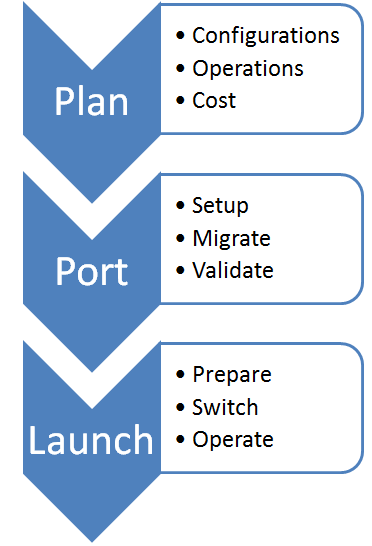 - Cloud Migration Process: Once the applications are identified as right candidates for migrating on to the cloud, the next step is to start planning, porting and launching the applications.